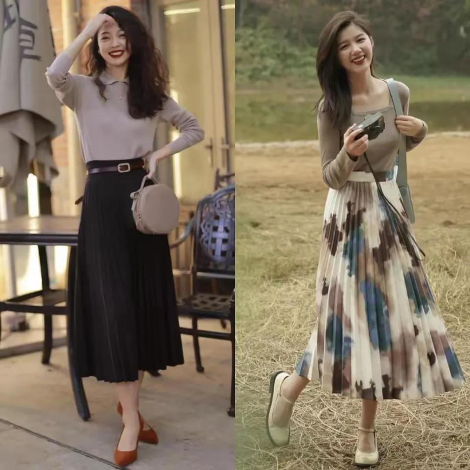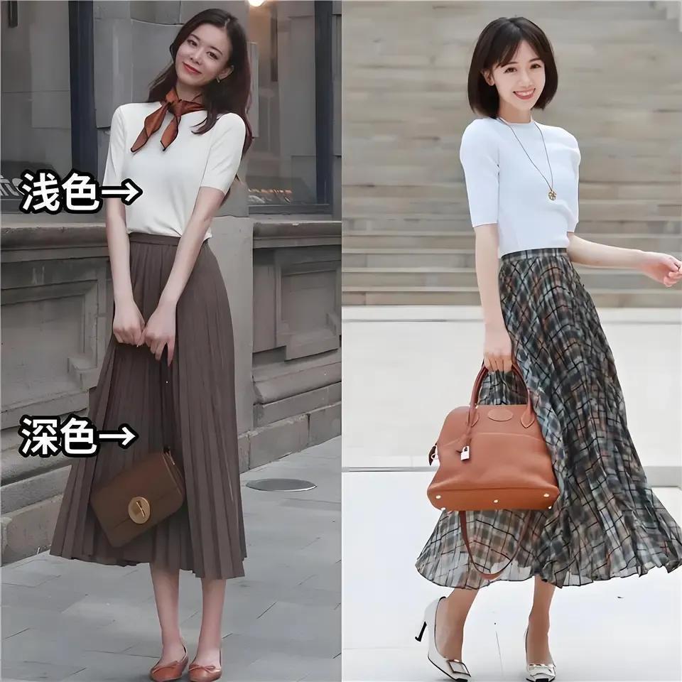 这条裙子也不可太长到小腿肚的位置,最好适合的留白草率显降生腿部线条,让你的下半身更修长,比如底下用一件白色的真挚短袖,搭配上一款深咖色的百褶半身裙,脚上穿的是一对棕色的羊皮材质浅口单鞋,这么的穿搭就很上端倪,穿去上班,逛街,约聚皆莫得任何问题,变得通勤又斯文。