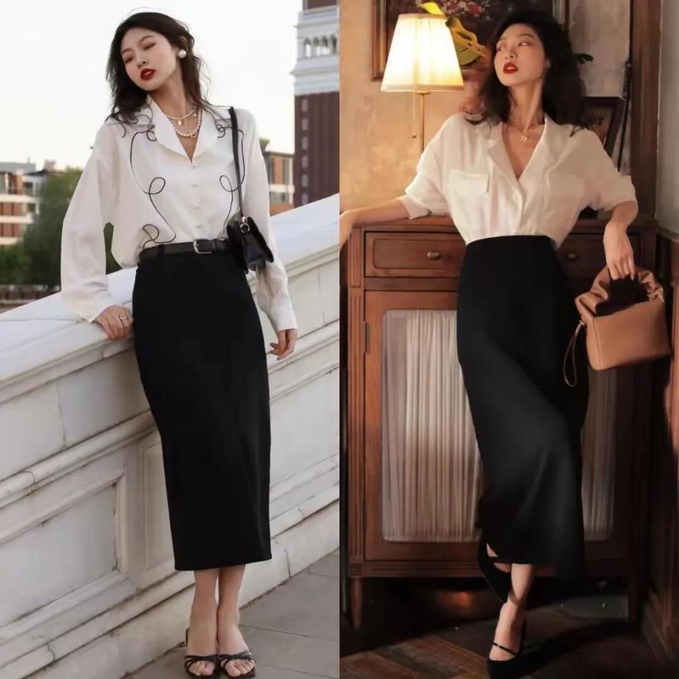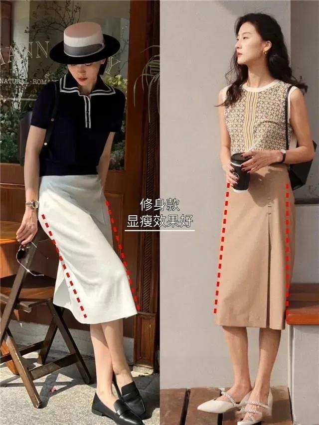 比如说你的体格比例很可以的情况下,这技巧你秉承的裙子我们就斗胆的去尝试修身款,比如底下这种直筒修身款的半身裙,穿在身上之后显瘦成果就很好。