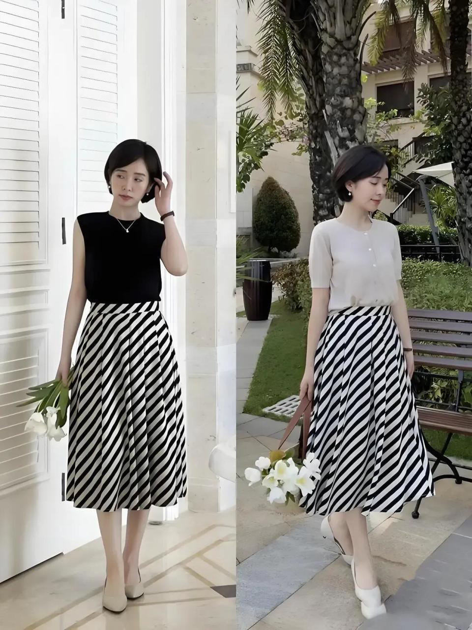 如果是小个子女生的话,我们可以秉承低跟单鞋,鞋跟收尾在三到五厘米最好,举例底下这两双鞋子,搭配黑白条纹的压褶半身裙和真挚上衣,扫数这个词东说念主就显高显瘦,如果不说这位达东说念主是属于1米60以下的小个子女性,可能你皆以为她是在1米65足下身高。