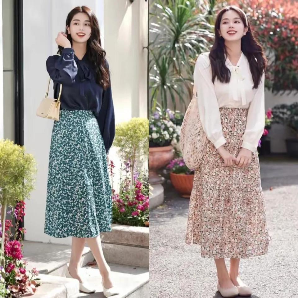 念念要我方的造型变得愈加致姑娘文,我们还可以用碎花的半身裙来搭配上纯色系的衬衫,上衣碎花的裙子放不才半身,这么我们视觉要点会往下移,这技巧全体的穿搭并不会显得凌乱,反而会更前锋。