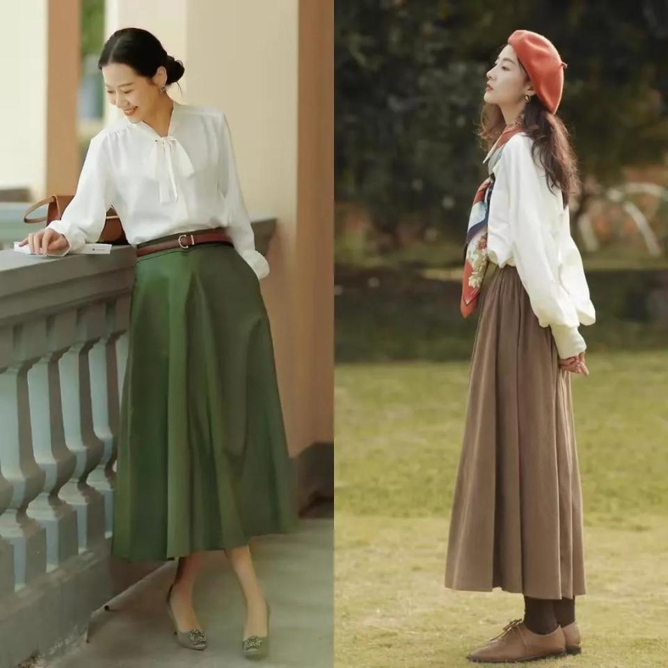 再比如底下用一件白色的雪纺衬衫搭配上军绿色的伞状半身裙, 件穿戴的色差很大,组合在一块就能变成一个撞色的成果,再加上棕色的小腰带,培植腰线的成果就很好,能使得穿搭者的体格比例变成一个三七分。