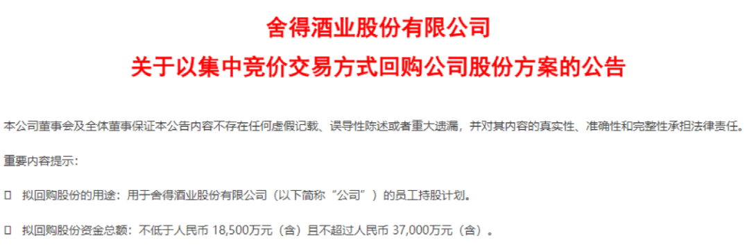 在表示半年报的同期,舍得酒业还抛出了回购股份绸缪。公告显现,公司拟以逼近竞价贸易样式回购公司股份,本次拟用于回购的资金总数不低于1.85亿且不进步3.7亿元,回购价钱不进步210元/股,较最新价135.39元/股有55%的空间。