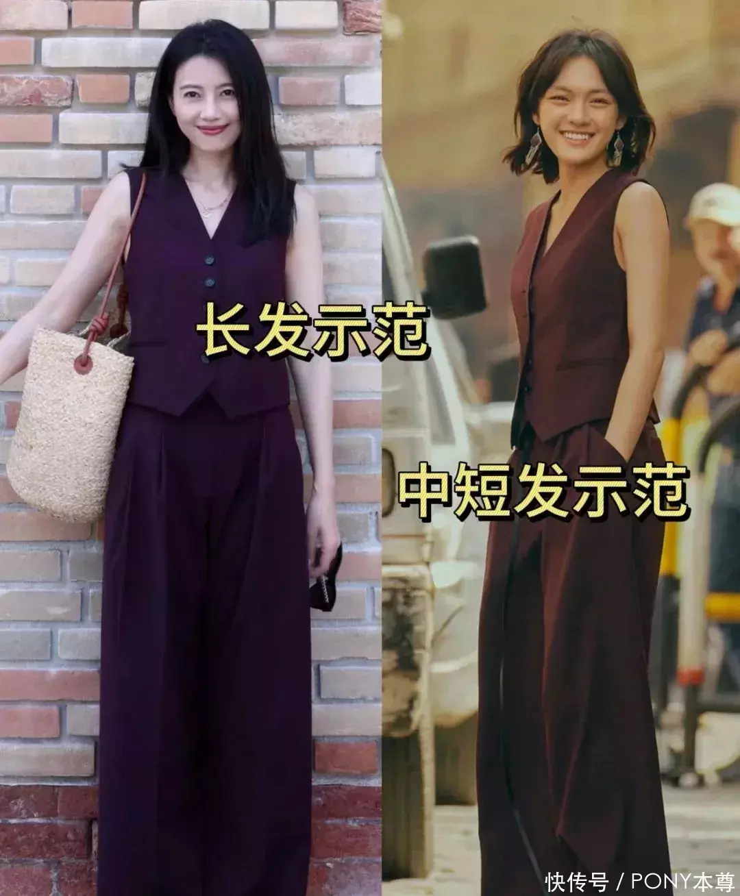 除了白色,酒红色自带知性熟识感,也备受职场女性青睐!高圆圆和文淇同穿酒红色西装马甲搭配同色西装阔腿裤,一个长发温婉一个中短发知性!