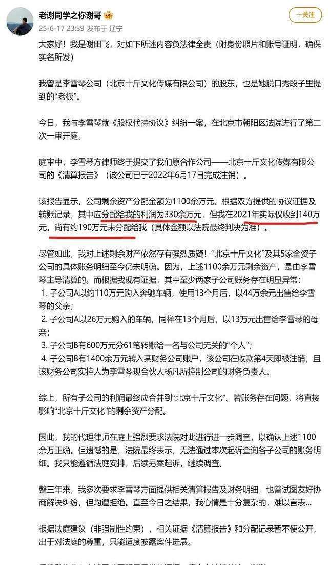老谢不仅举报李雪琴的公司存在财务问题,还格外指出李雪琴欠他190万元。
